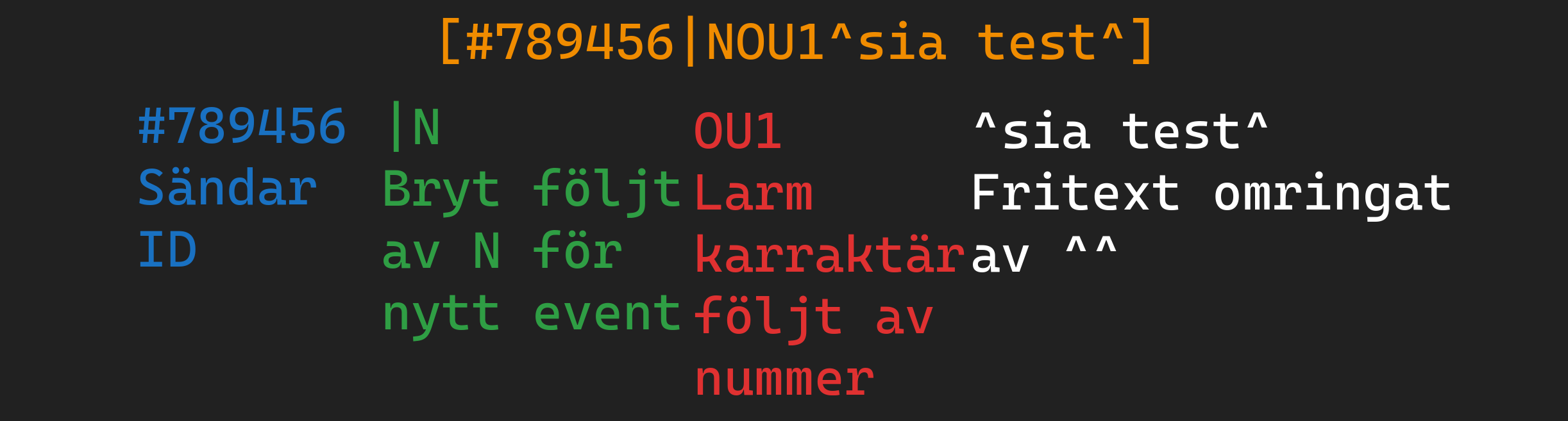 Så larmsträngen kan läsas som ”Från anläggning med ID 789456, nytt medelande, utgång nummer 1 med namn 'sia test' aktiverad”.